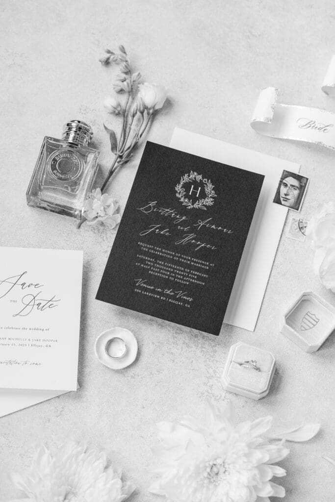 I think there’s something timeless about a winter wedding, and Brittany and Jake’s elegant celebration at Venue in the Vines at Engelheim Vineyards brought all the romance and sophistication of a classic black-tie affair. With the vineyard’s misty hills as a backdrop and a modern color palette of black, white, and gold, their February wedding became the perfect reflection of refined beauty and heartfelt moments!